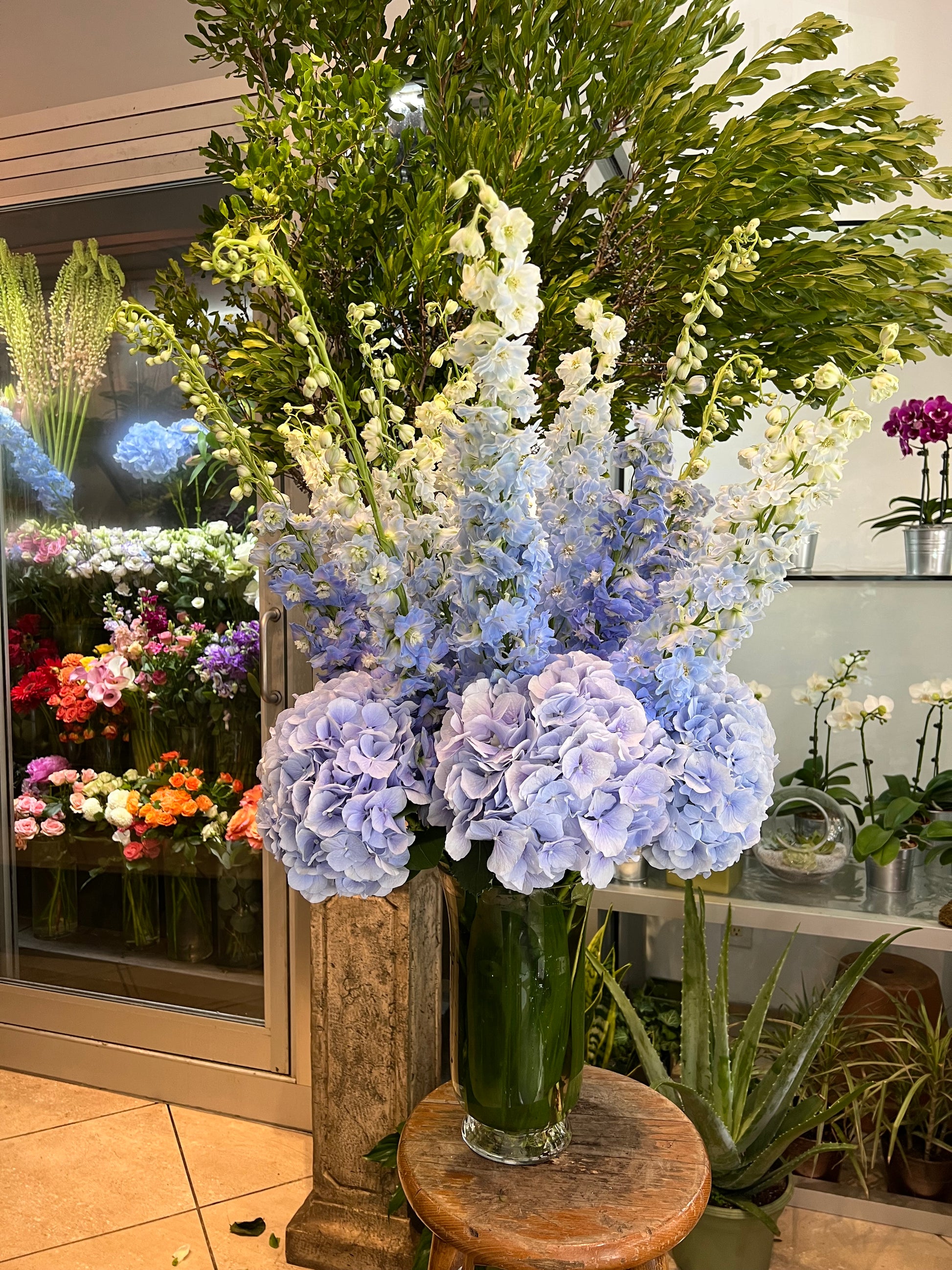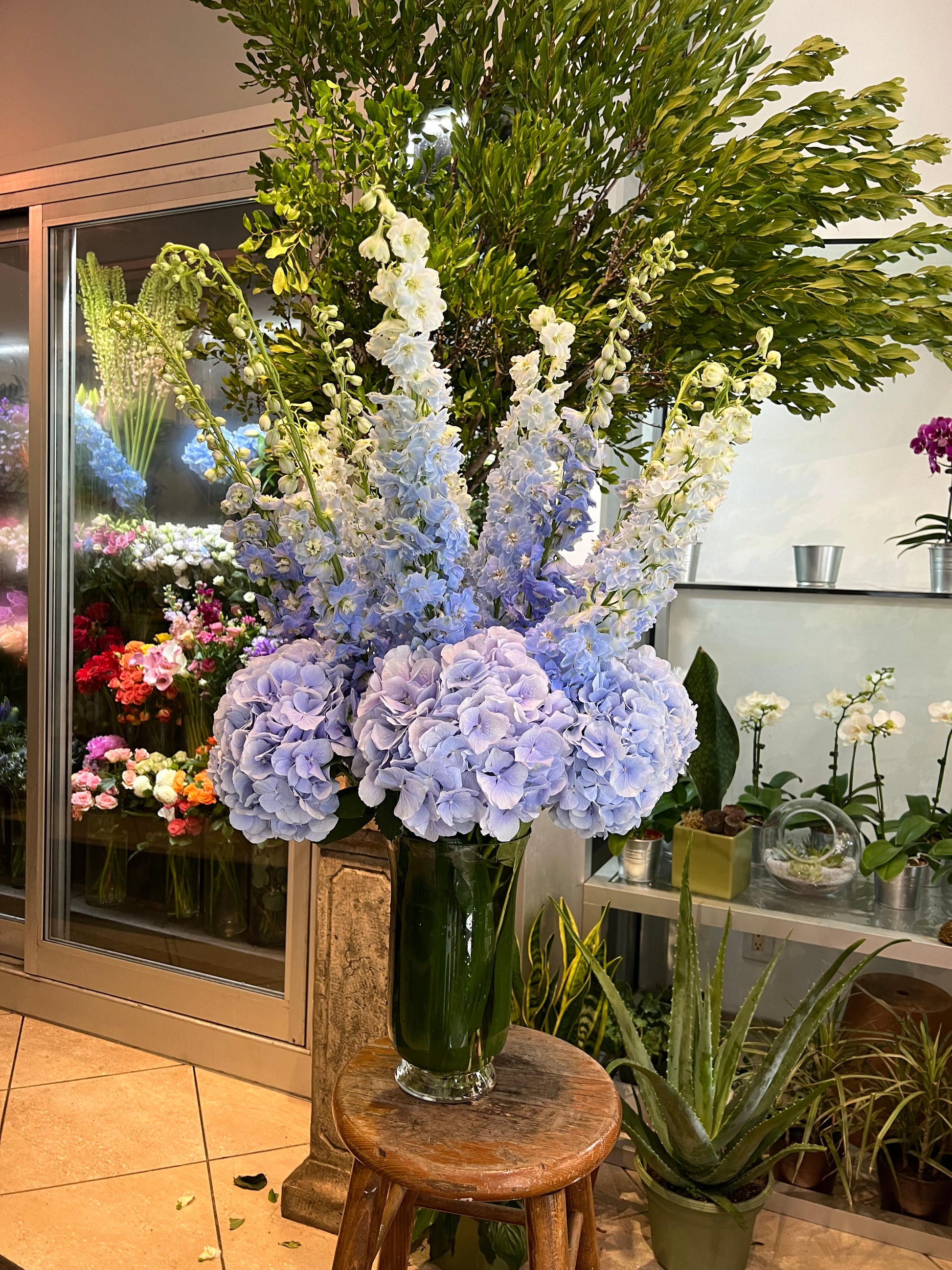 Blue hydrangeas with blue delphinium. Immerse yourself in the tranquil beauty of "Baby Blue", featuring soft blue hydrangeas and delphinium. This serene arrangement evokes calm and peace, making it perfect for baby showers, weddings, or creating a peaceful ambiance in your home. Available in both Grand and Standard sizes, "Baby Blue" offers a delicate touch of elegance and grace.
